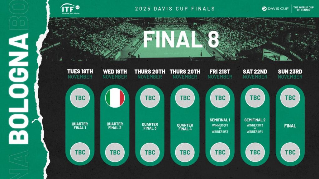 The Davis Cup Final 8 will head to Bologna, Italy, marking a new chapter for the prestigious tennis competition. After three years in Malaga, Spain, the team event moves to northern Italy, where it will be staged from 2025 through 2027. The 2025 edition will run from November 18 to November 23, bringing an elite eight-nation knockout format to one of Italy’s most vibrant cities.